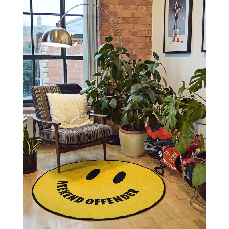 Weekend Offender branded low loop pile circular rug featuring our iconic smiley graphic.