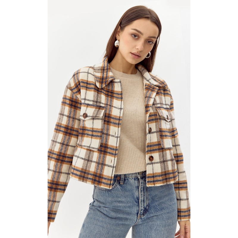 Plaid, short jacket rendered in rustic shades. The outerwear piece is made from a slightly thinner material to be worn comfortably layered.