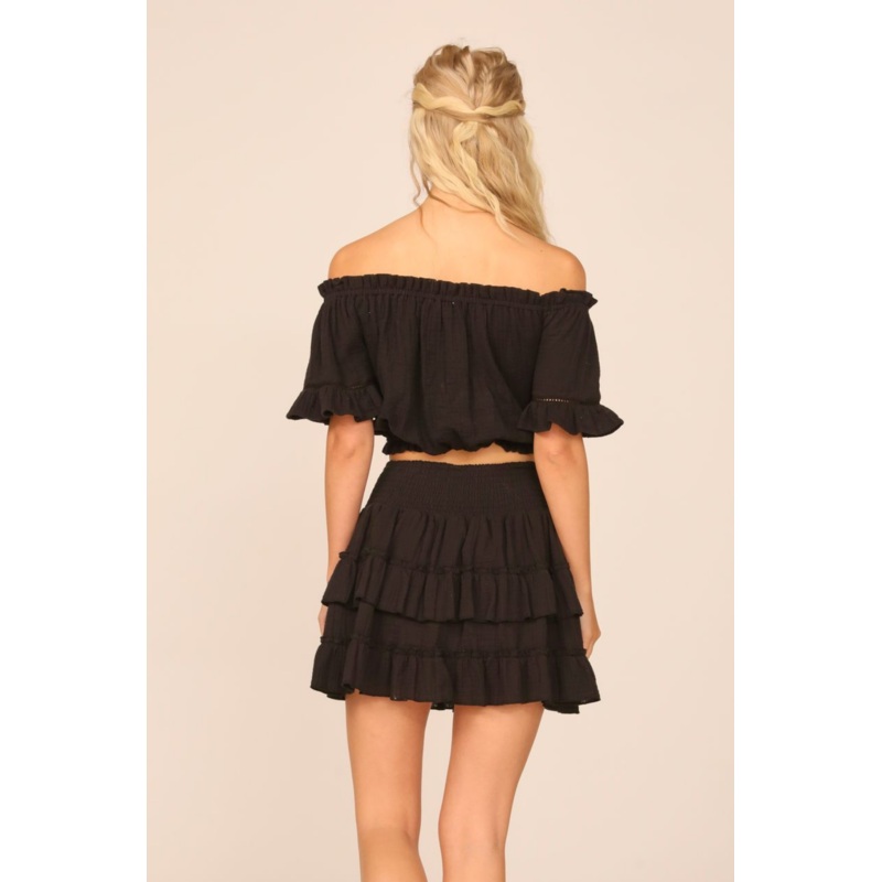 The Black Gauze Off the Shoulder Bell Sleeve Top features: